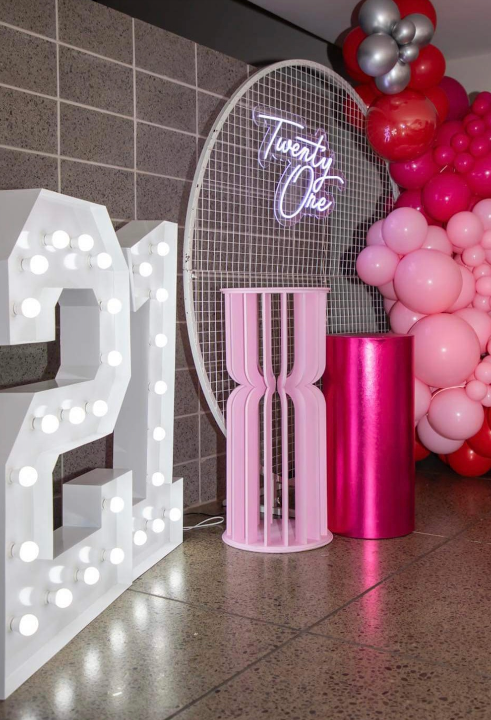 Add a splash of fun to your party with our Balloon Tower! This mini package includes a neon light, balloon garland, and shimmer panels for a unique and eye-catching centerpiece. Perfect for any celebration!